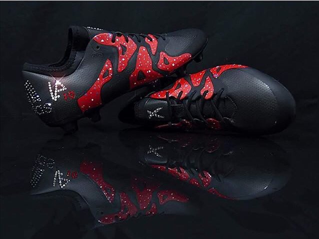 Alexandre Lacazette, meilleur buteur de la Ligue 1, saison 2014-2015, possède une paire de crampons personnalisée par le spécialiste de la personnalisation de chaussures, Orravan Design. C’est la rédac du site Footpack qui a repéré ces chaussures adidas X avec des cristaux de Swarovski incrustés. Le modèle de fond, noir et rouge avait déjà été porté par le joueur.